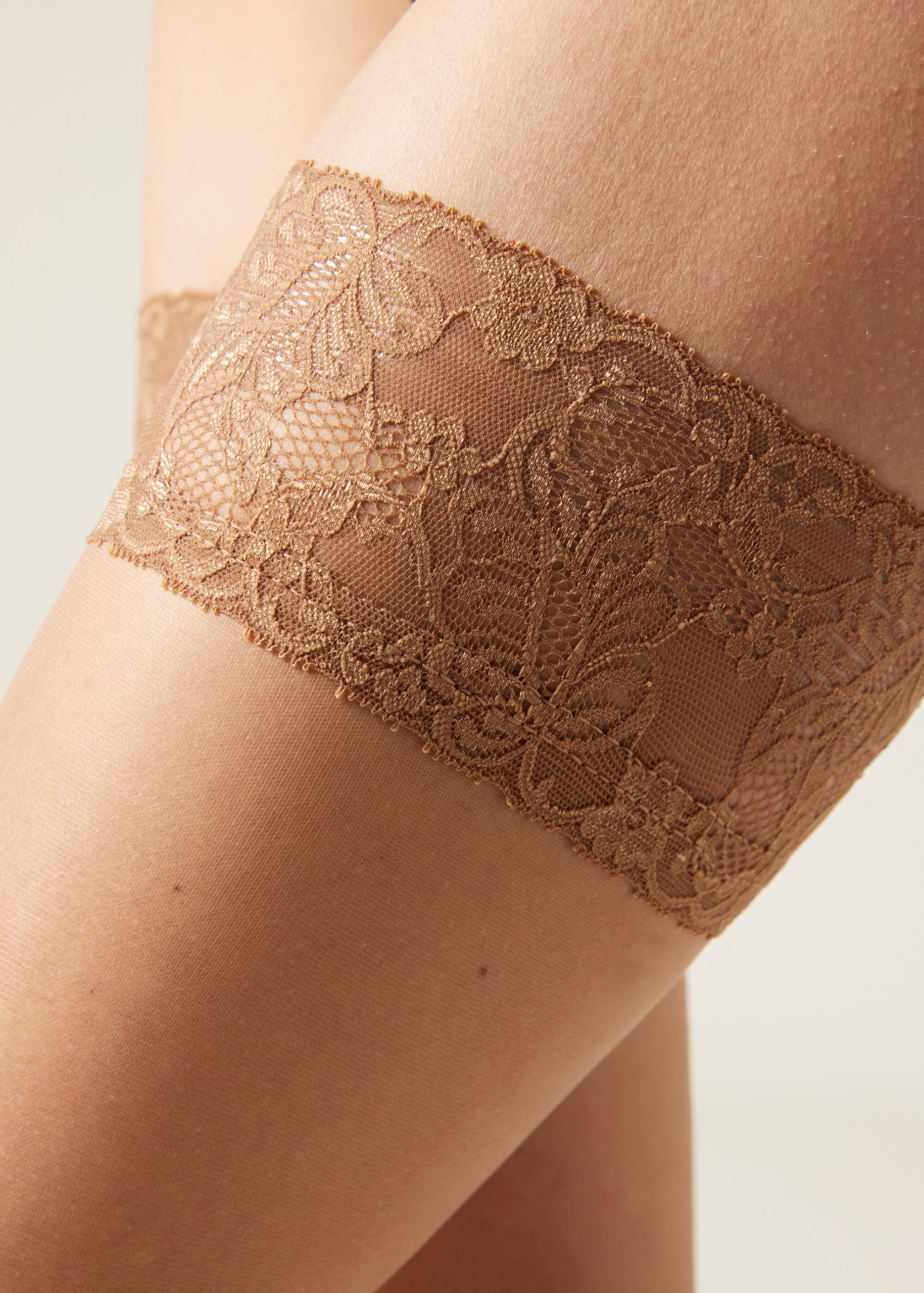 8 denier ultra sheer thigh-highs with a silicone lined lace top and invisible toes.