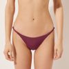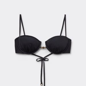 Unpadded balconette swimsuit top with underwire, featuring a minimal fit that exalts the silhouette with a touch of sensuality and refinement. The bright silk-effect fabric embellished by elegant golden details radiates a sophisticated sensation of discrete luxury. Adjustable shoulder straps and string tie fastening complete the design for this summer look that does not pass by unnoticed.