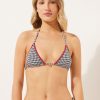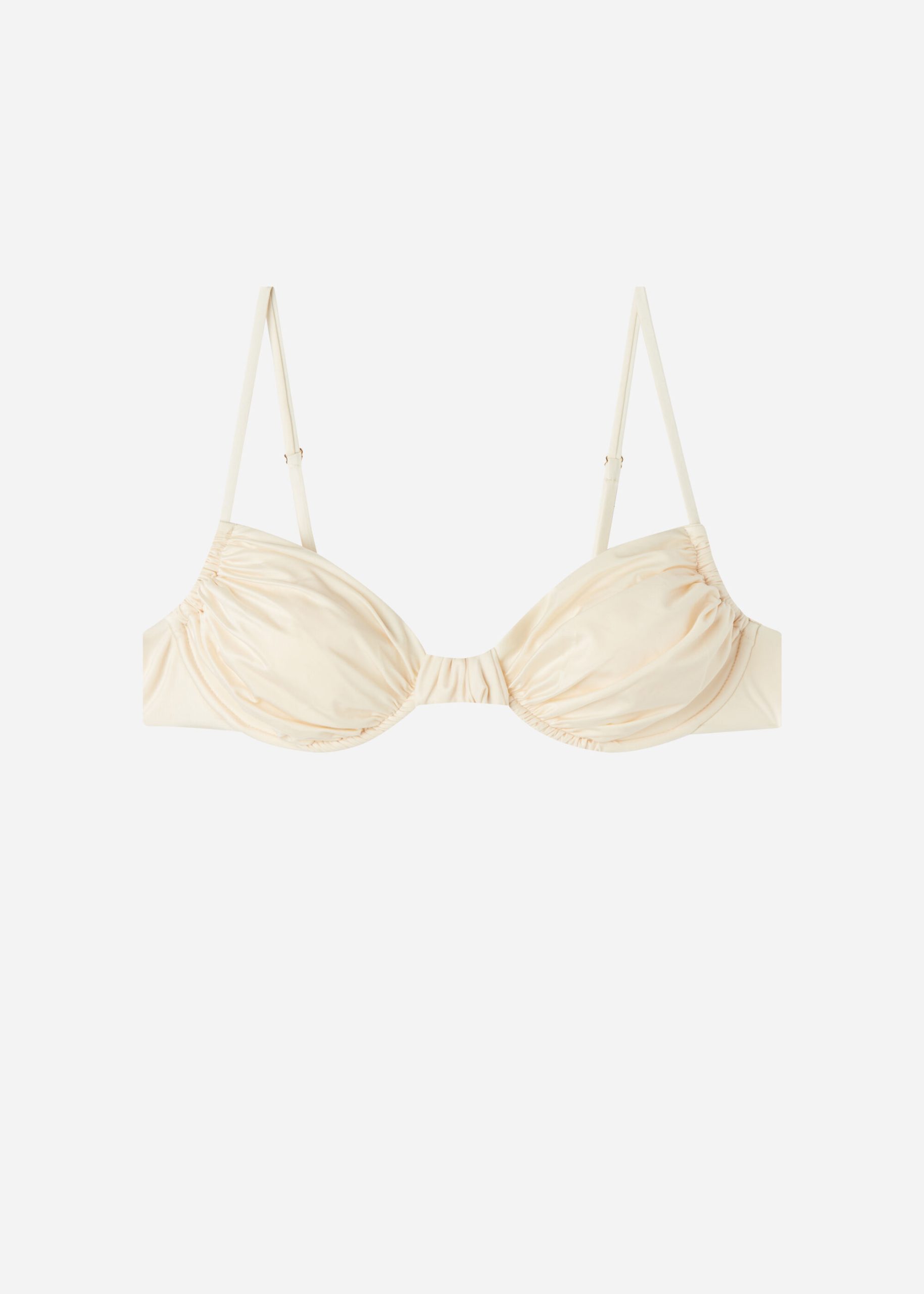 Unpadded balconette bikini top with underwire. The structure of the cups perfectly embrace and support the bust, thanks to the side drawstring on the cups that can also adjust the fit. Ideal for the larger bust. The style features a bright fabric with a silky effect, embellished by ruffles and gold tips. Adjustable straps and hook closure with two adjusters.