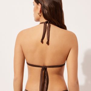 Unpadded balconette bikini top with underwire. The structure of the cups perfectly embrace and support the bust, thanks to the side drawstring on the cups that can also adjust the fit. Ideal for the larger bust. The style features a bright fabric with a silky effect, embellished by ruffles and gold tips. Adjustable straps and hook closure with two adjusters.