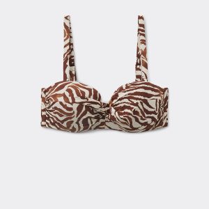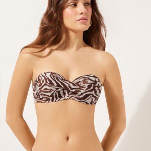 Lightly padded bandeau bikini top with underwire and side boning to guarantee good support, perfect for those with larger busts. The crisscross in the center of the bust enhances the décolleté. The style features a sophisticated Brown Zebra print. Adjustable and removable shoulder straps. Back hook closure with two adjusters.