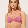 Lightly padded straight-cut bandeau bikini top, wireless for a natural effect. The side boning helps support the bust. Striped patterned fabric in bright colors enhanced with sparkling glitter, creating a dynamic and contemporary effect with its soft texture and vibrant look. Removable shoulder strap. Back tie closure.