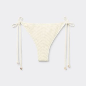 Brazilian cut bikini bottoms with side ties made from refined and sophisticated crochet fabric. The slightly rounded waist at the front allows for both a classic or more high-cut fit, depending on one’s physique. Fully lined with invisible seams.