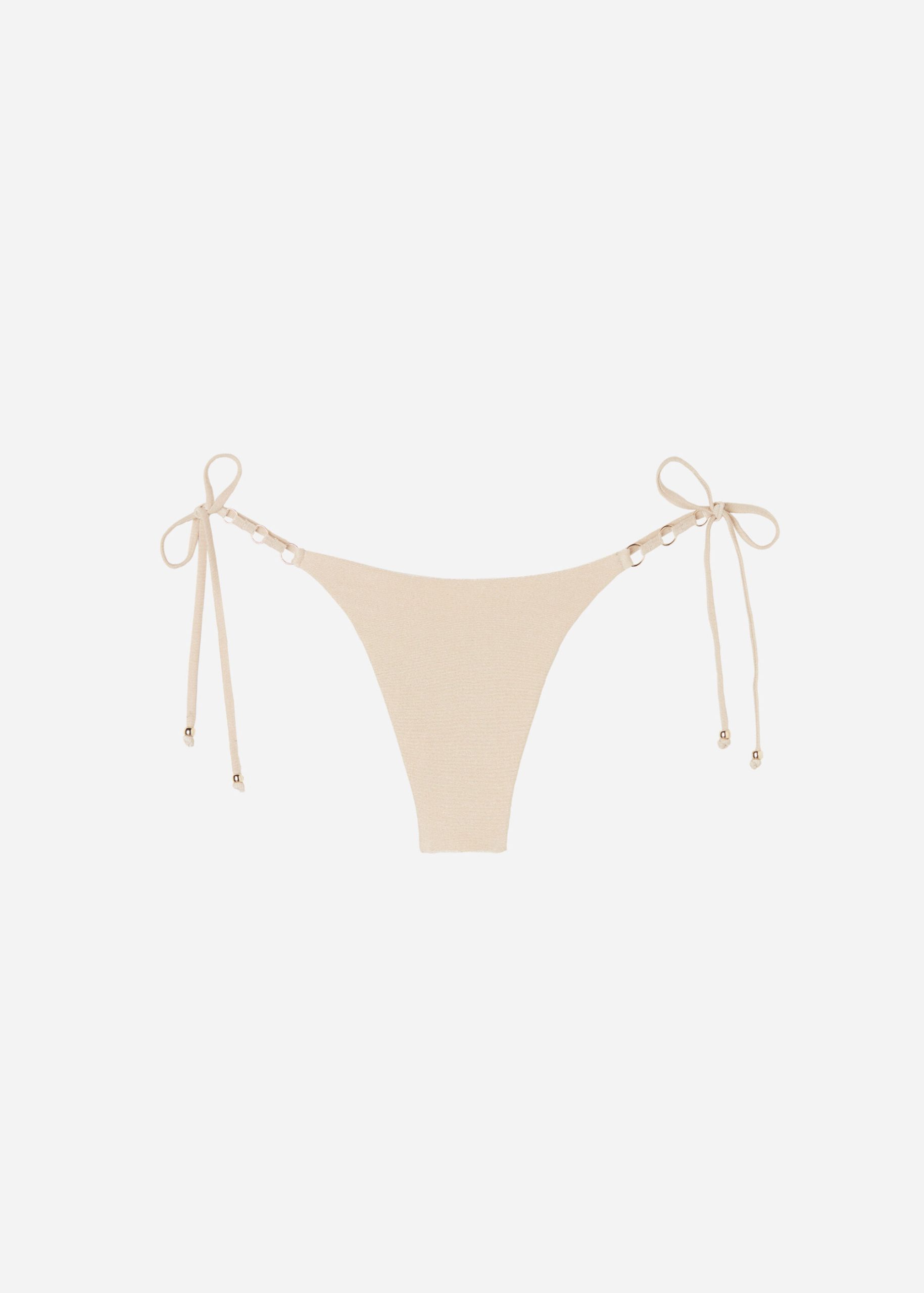 Brazilian cut bikini bottom with side ties to adjust the fit. Soft fabric with shiny lamé thread embellished with nickel free small gold rings. Fully lined. Back gathered seam for a better fit.