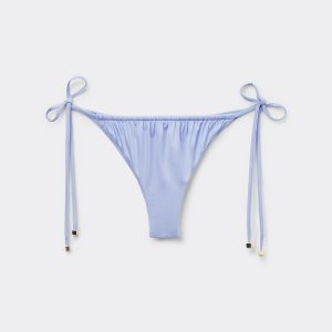 Brazilian cut bikini bottom with side ties to adjust the fit. The style features a bright fabric with a silky effect, embellished by ruffles and gold tips. Fully lined with invisible seams.