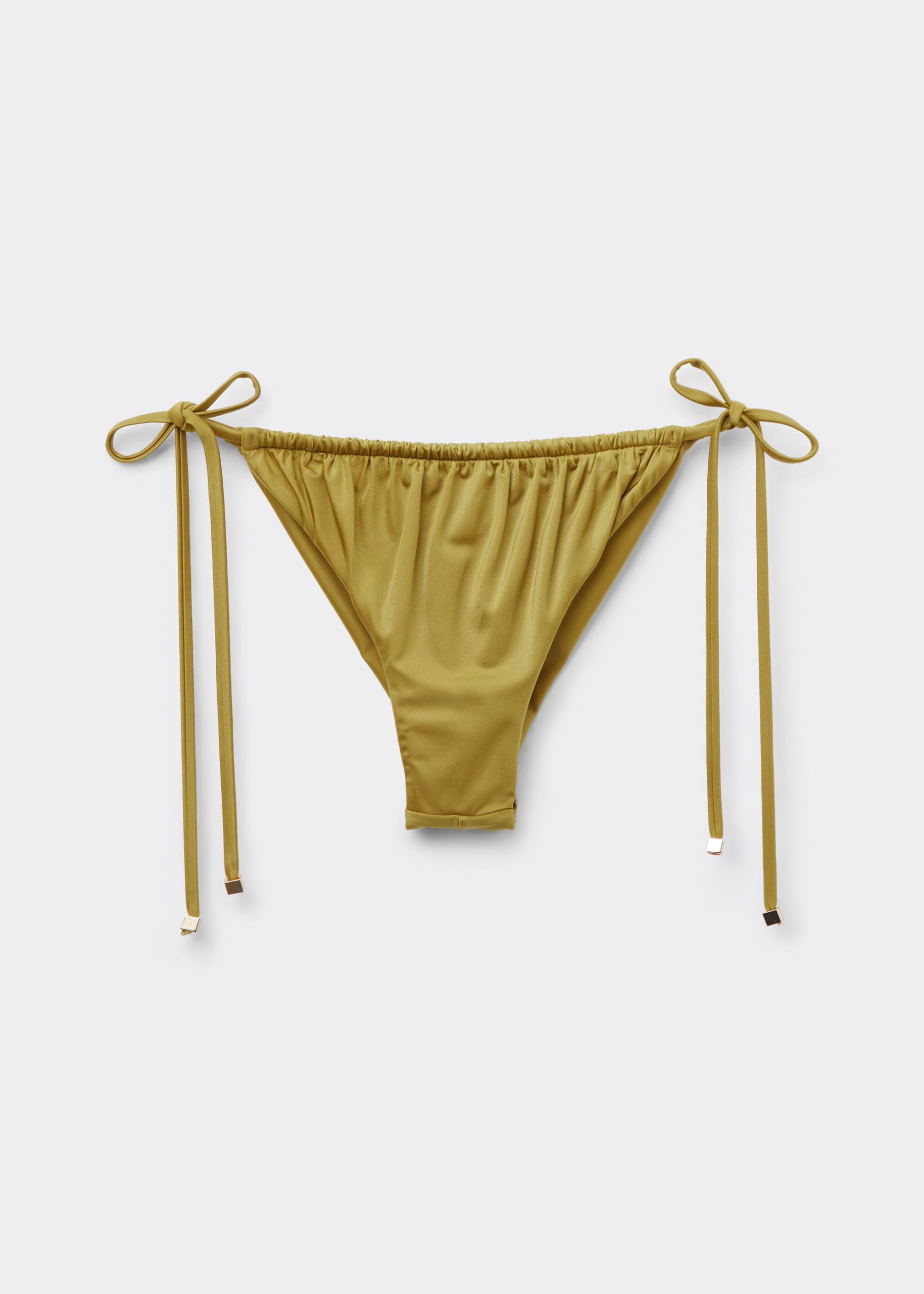 Brazilian cut bikini bottom with side ties to adjust the fit. The style features a bright fabric with a silky effect, embellished by ruffles and gold tips. Fully lined with invisible seams.