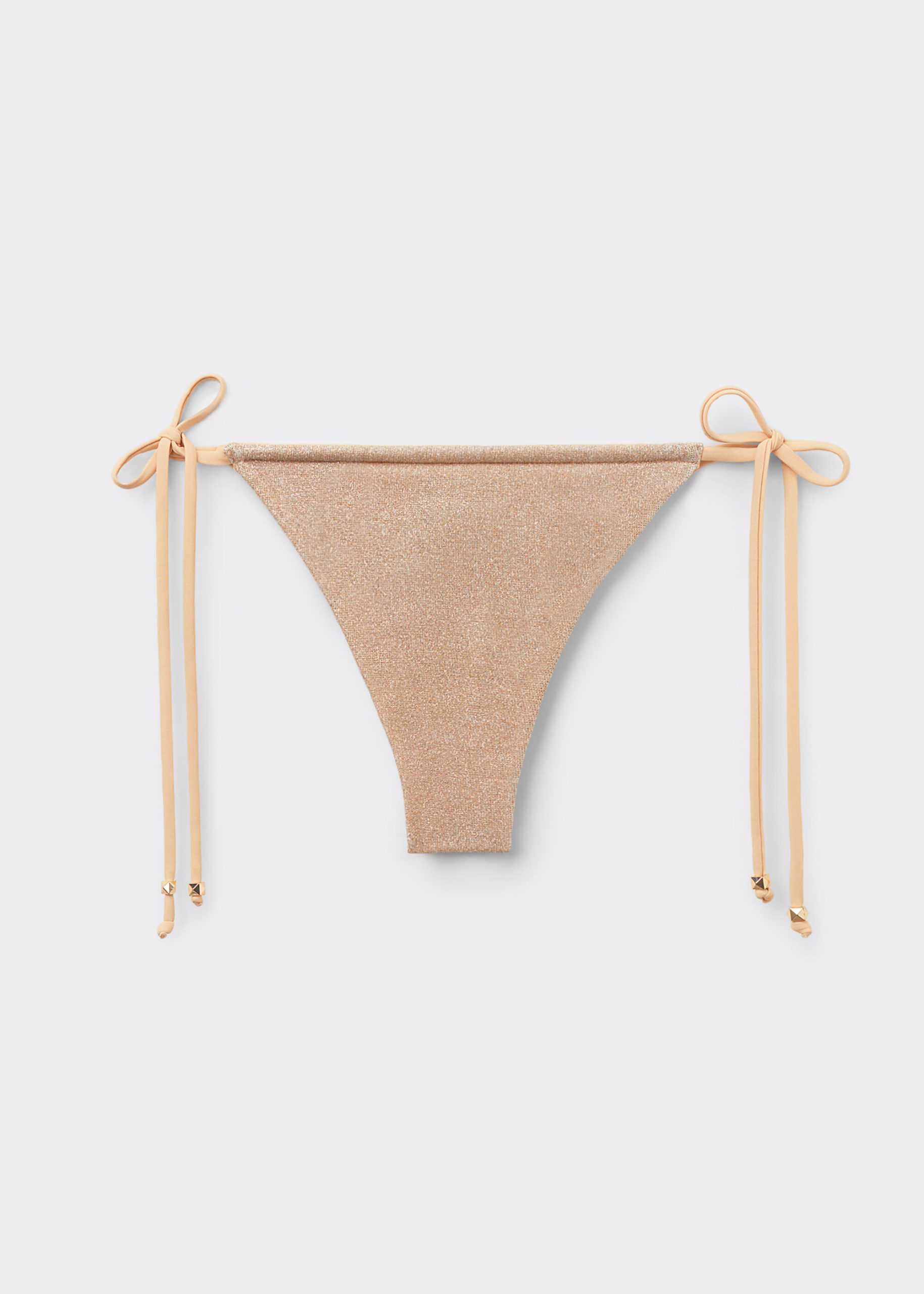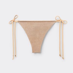 Brazilian cut bikini bottoms with side ties to adjust the fit. The bright glittery fabric stands out with its sophisticated shine, perfect for a glamorous look. Fully lined. Back gathered seam for a better fit.