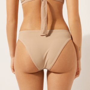Brazilian cut bikini bottoms with side ties to adjust the fit. The bright glittery fabric stands out with its sophisticated shine, perfect for a glamorous look. Fully lined. Back gathered seam for a better fit.
