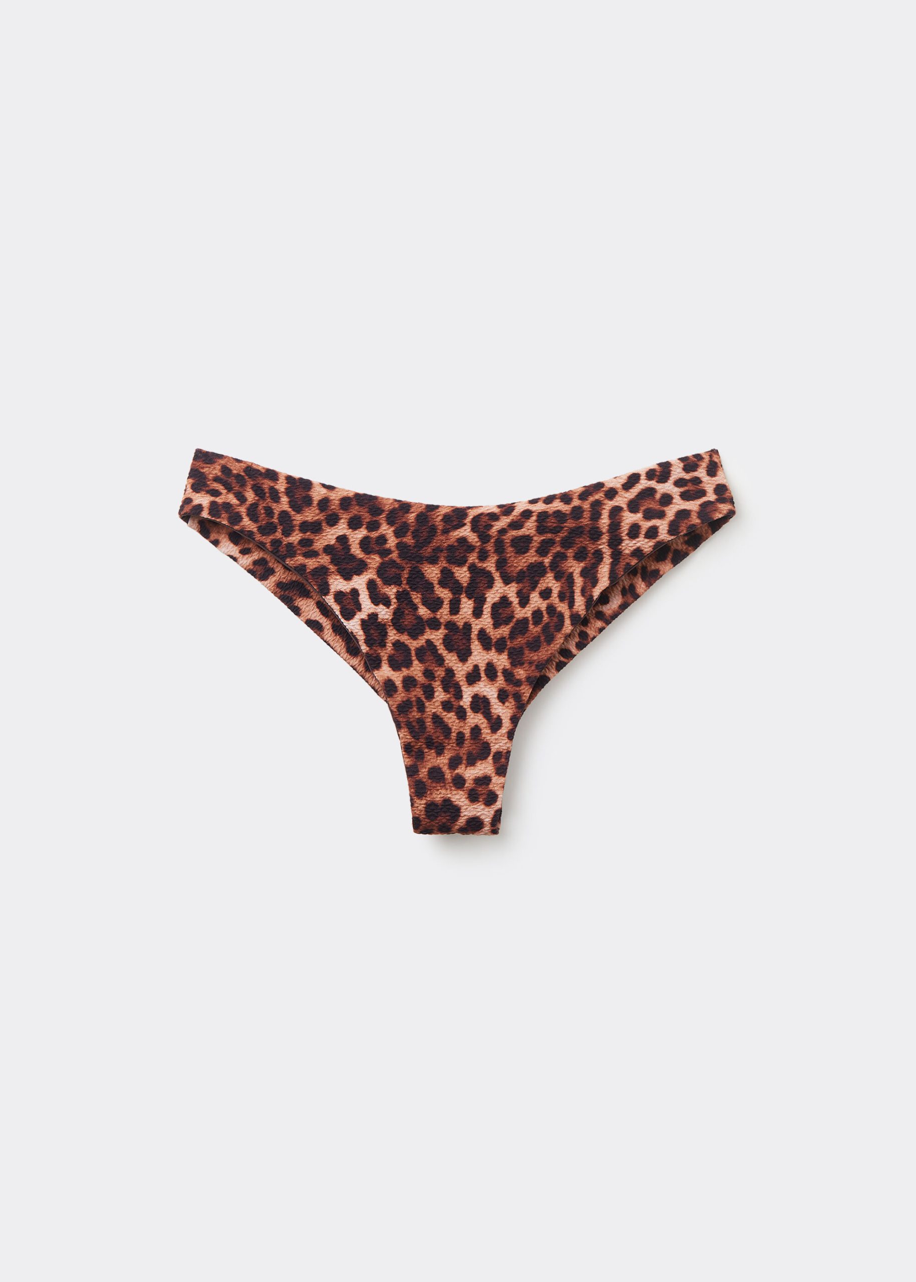 Brazilian bikini bottom with invisible seams. The slightly rounded waist at the front allows for both a regular and more high-cut fit, depending on one’s physique. The style features an elegant animal pattern and lightly ruched fabric.