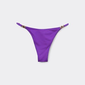 Brazilian bikini bottoms with adjustable side panels, featuring a minimal fit that exalts the silhouette with a touch of sensuality and refinement. The slightly rounded waist at the front allows for both a regular and more high-cut fit, depending on one’s physique. The bright silk-effect fabric embellished by elegant golden details radiates a sophisticated sensation of discrete luxury. Fully lined with invisible seams.