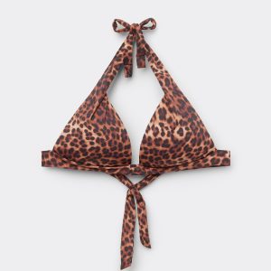 Wireless fixed triangle bikini top with graduated padded cups that add volume to enhance the décolleté. The style features an elegant animalier pattern and a precious accessory in the middle of the bust line. The shoulder straps with eyelets can be inserted into the band on the back or fastened behind the neck. Back bow closure.