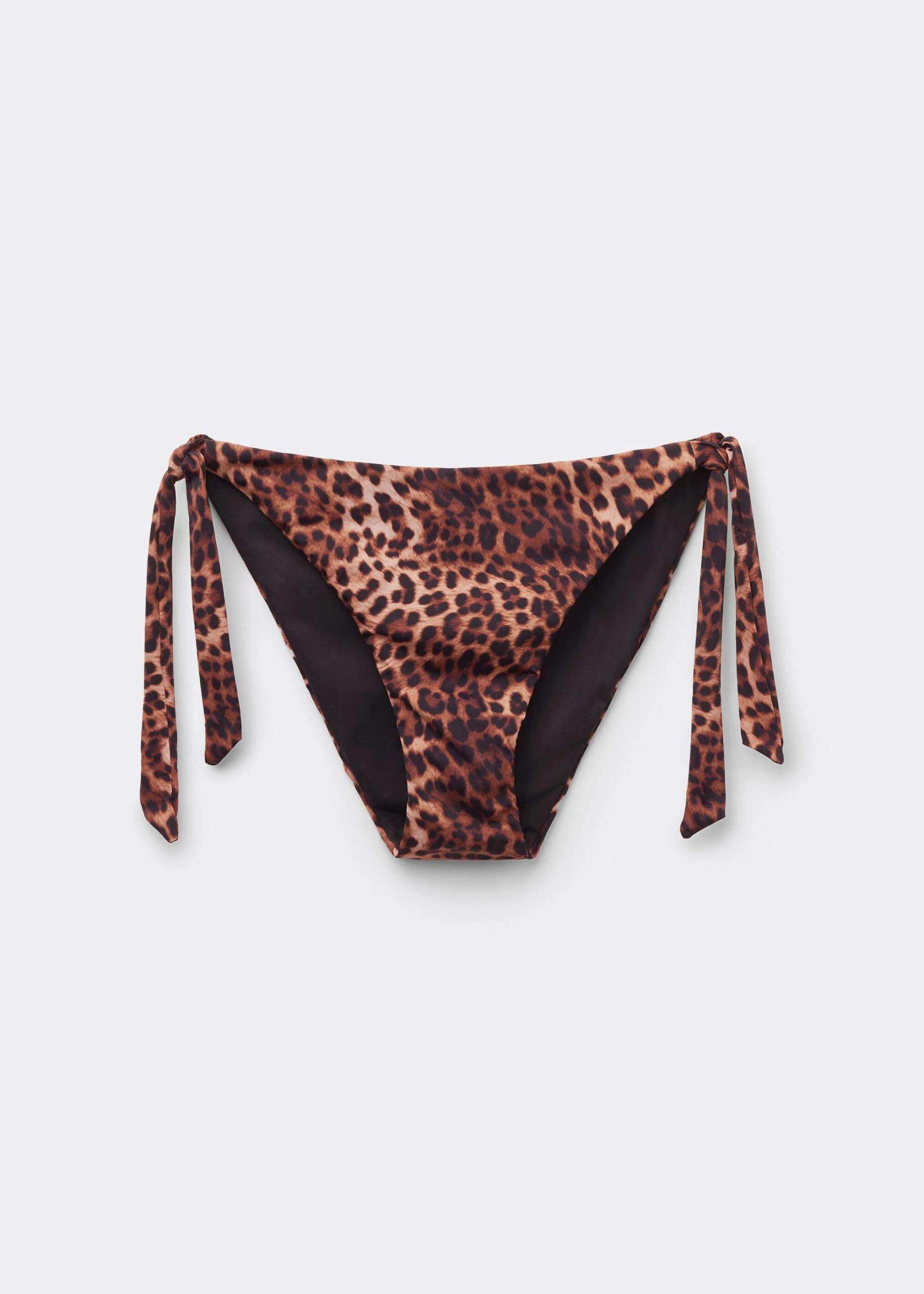 Bikini bottoms with bow closure on the sides for an adjustable fit. The style features an elegant animalier pattern. The slightly rounded waistline allows it to be worn both regularly and with a higher leg, enhancing the physique. Fully lined with invisible seams.