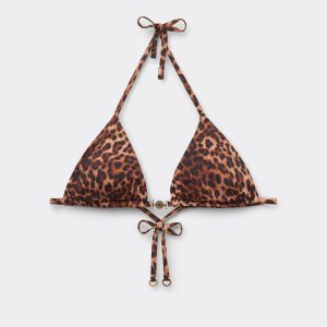 Slide triangle bikini top with removable padding, wireless for a natural effect. The style features an elegant animal pattern. The shoulder straps with eyelets can be inserted into the band on the back or fastened behind the neck. Fastens with a string tie in back.