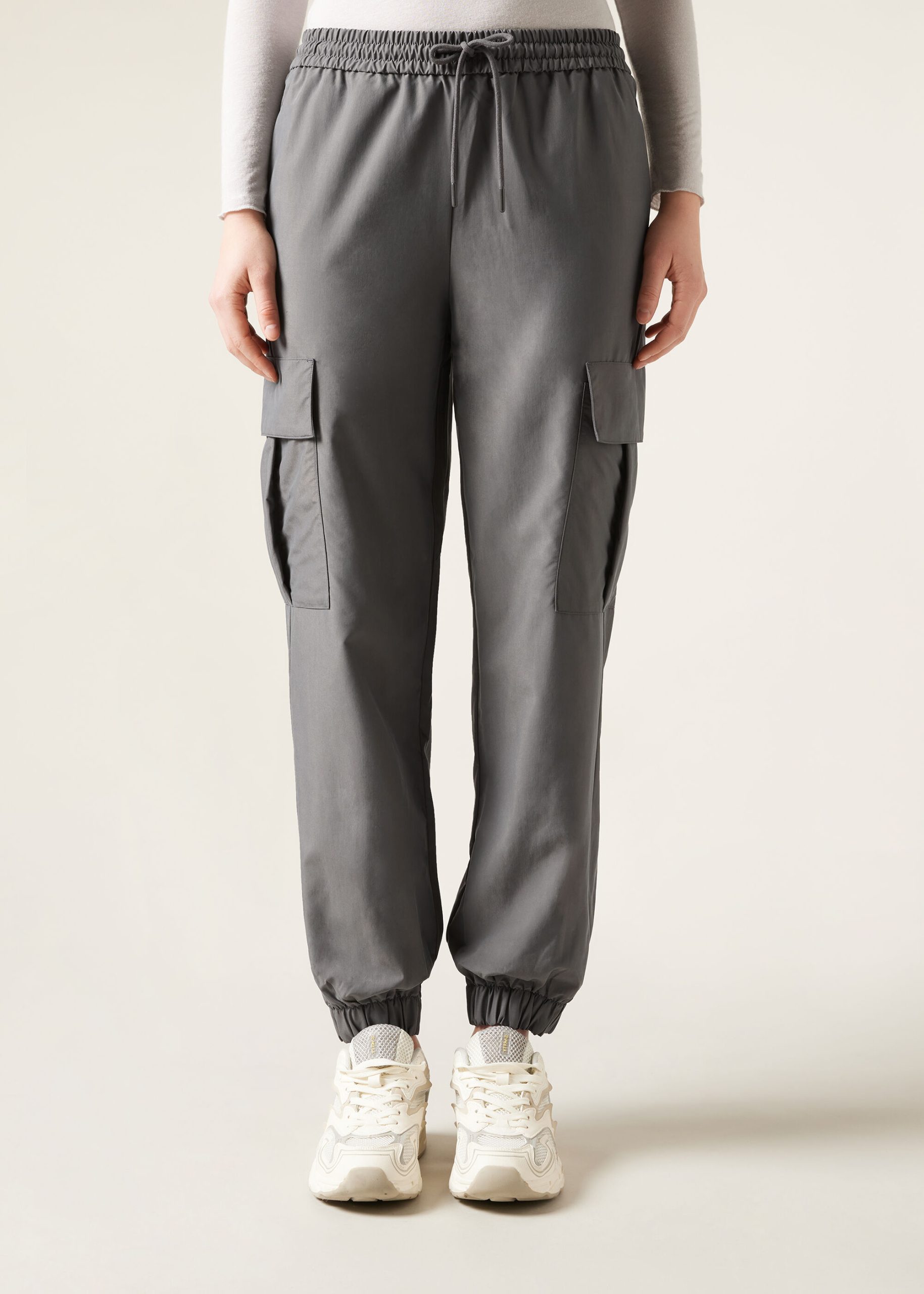 Cargo pants in soft touch modal, featuring convenient side pockets and cuffed hems for a modern fit. The elastic drawstring waist offers comfort and practicality, making them perfect for a casual and functional look.