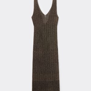 Maxi dress crocheted in refined golden lamè, featuring and elegant V neckline on both the front and back. The sophisticated side slits provide movement and lightness, exalting the silhouette. Perfect for sophisticated and versatile looks, ideal to wear on top of beachwear or for special chic appeal occasions.