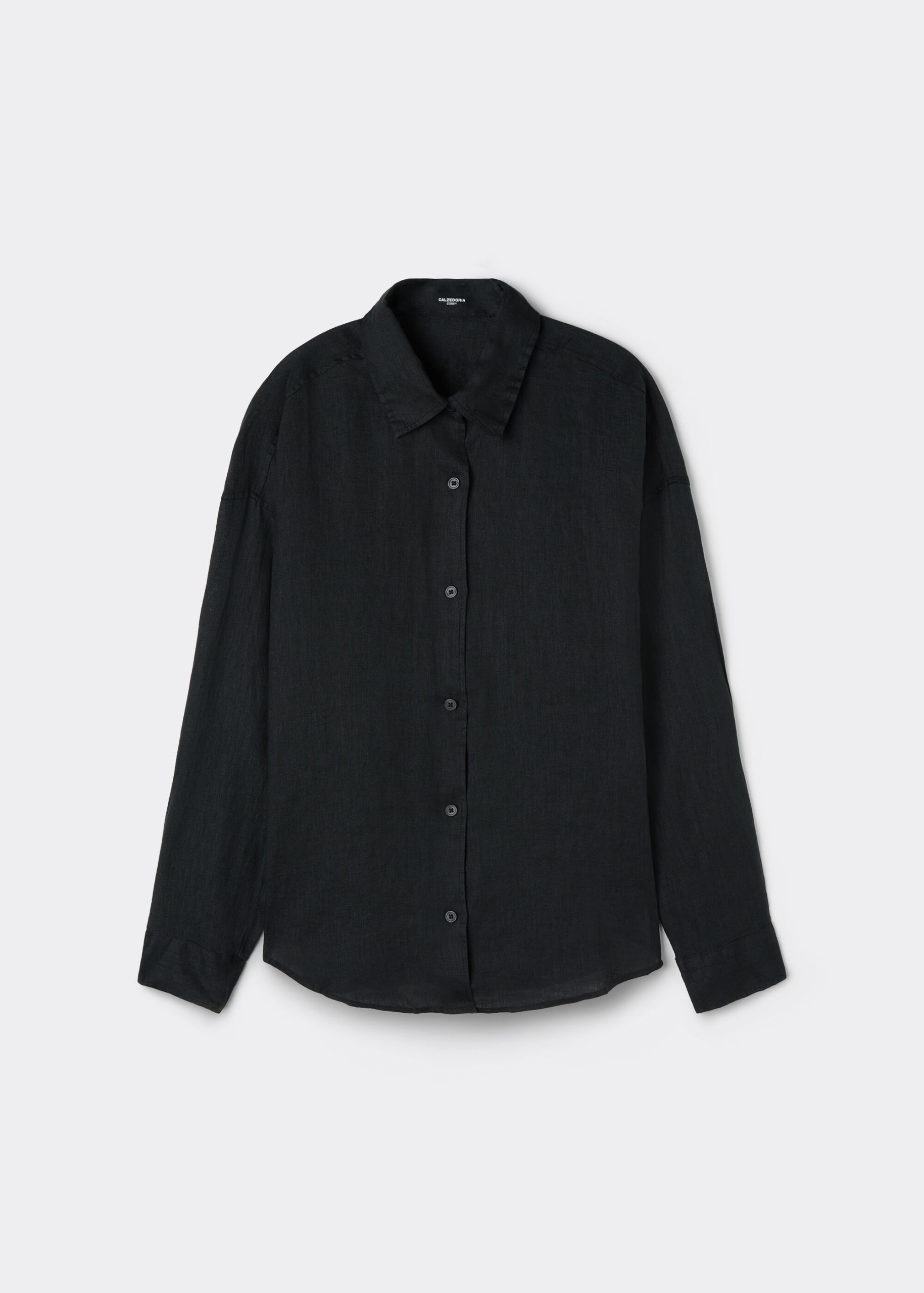 Cropped button-down shirt in linen, perfect for those who love natural fibers, with shirt collar and long sleeves.