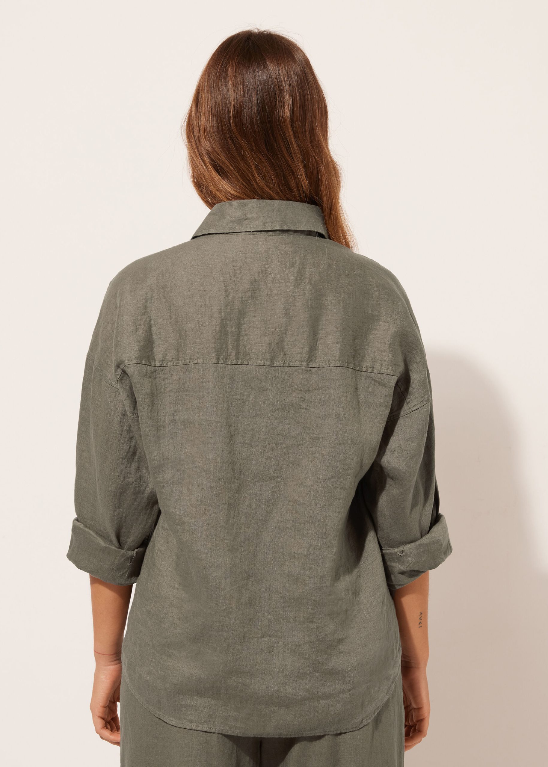 Cropped button-down shirt in linen, perfect for those who love natural fibers, with shirt collar and long sleeves.