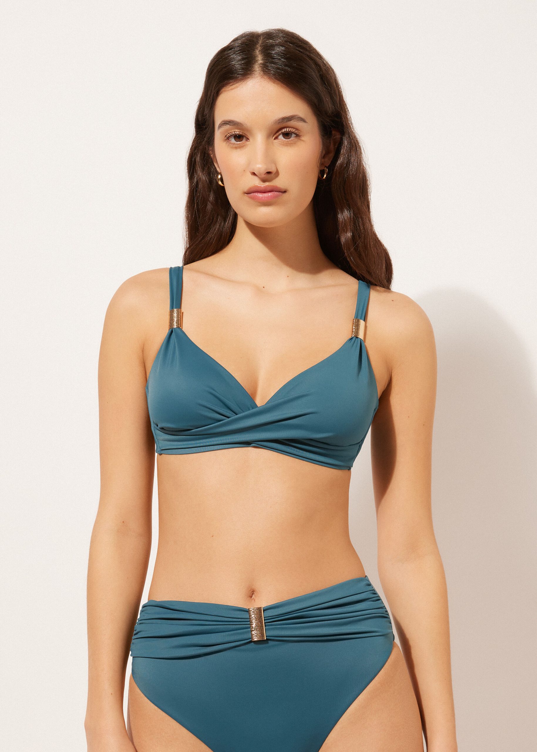 Triangle style bikini top, wireless and unpadded for a natural effect. The structure of the cups and the wide fit at the sides provide good support for larger busts. The compact fabric, designed to exalt and enhance the body’s curves, ensures excellent support and is studied to make every woman feel at ease without constraint. The center gore features draping in the middle and golden accessories that exalt its elegance. Adjustable shoulder straps. Back closure with two hook-and-eye closures to improve the fit of the underband.
