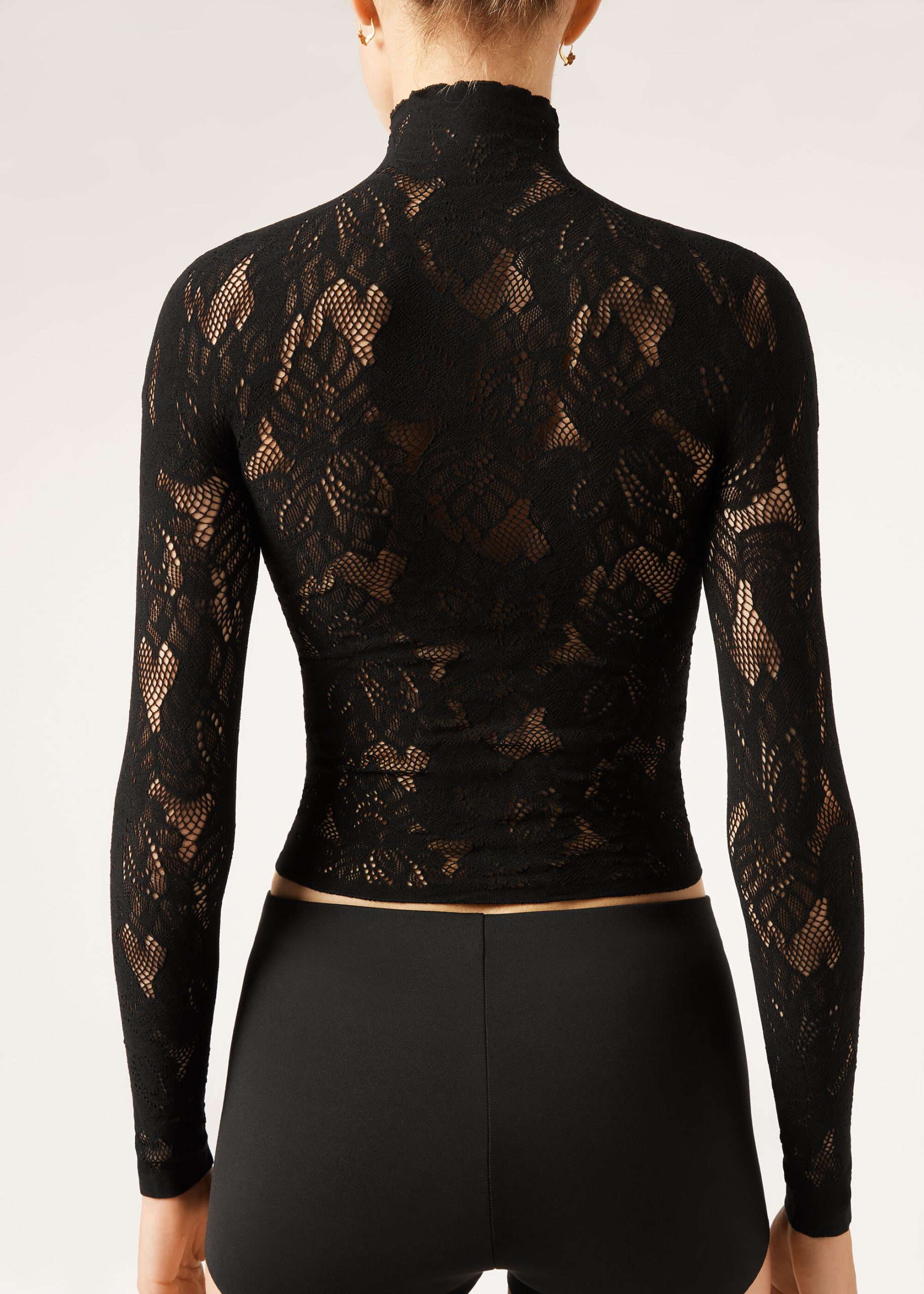 Floral motif mesh top, perfect to pair with coordinating tights MODC2185. With a funnel neckline and long sleeves, it is the ideal ally for an elegant and sophisticated look, even under a jacket.