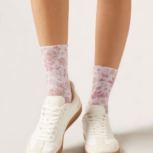 Women’s short socks with a floral digital print in delicate colors for a fresh and feminine look, perfect for a refined and original aesthetic.