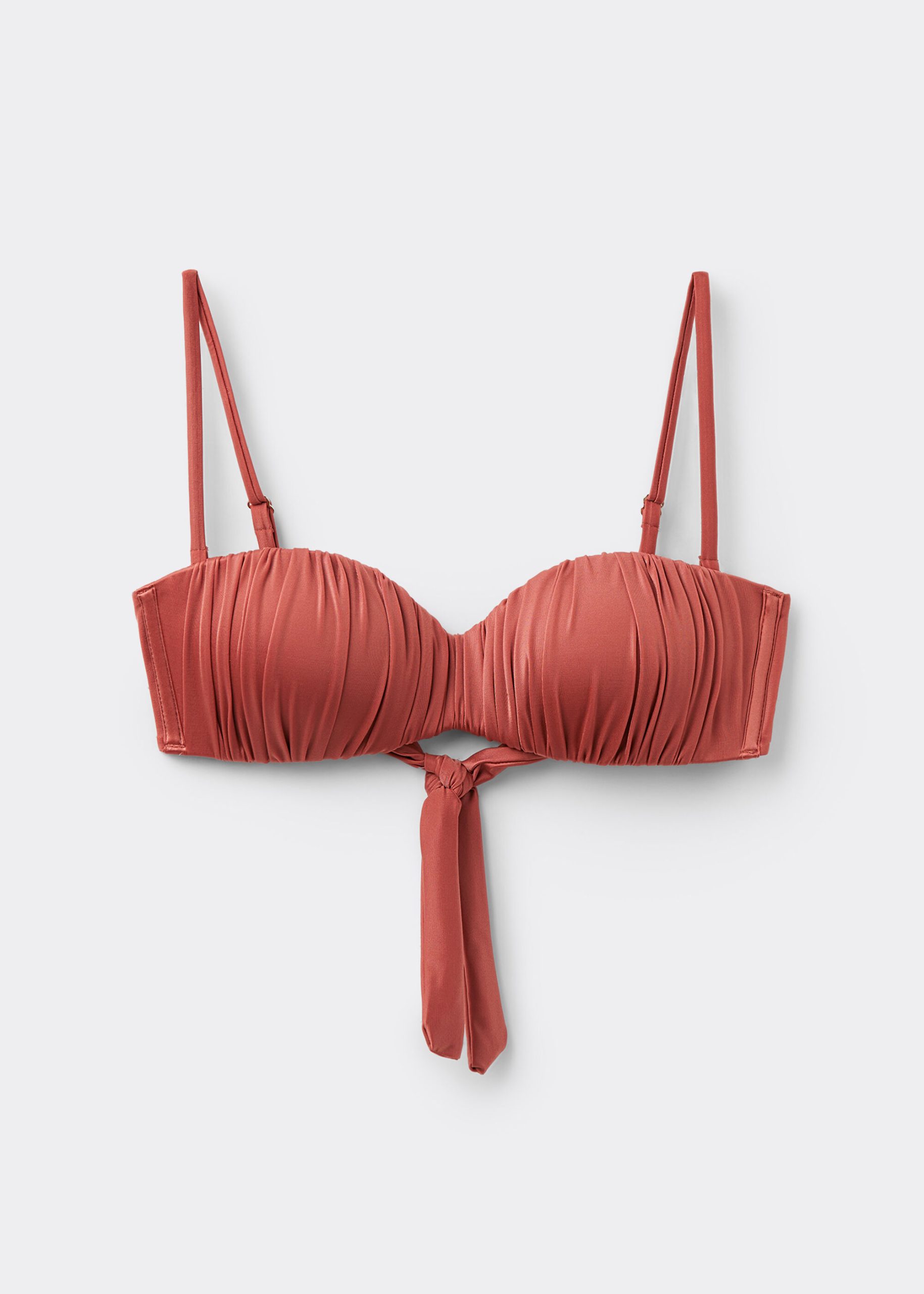 Bandeau bikini top with underwire, graduated padding cups, and side boning to guarantee good support, perfect for those with larger busts. The style features a bright fabric with a silky effect with ruffles. Adjustable and removable straps. Back tie closure.