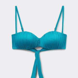 Bandeau bikini top with underwire, graduated padding cups, and side boning to guarantee good support, perfect for those with larger busts. The style features a bright fabric with a silky effect with ruffles. Adjustable and removable straps. Back tie closure.