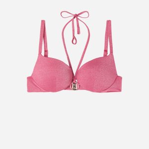 Push-up bikini top with graduated padding and underwire for more volume at the bust. Soft fabric with shiny lamé thread embellished with nickel free small gold rings. Adjustable straps and back hook closure.