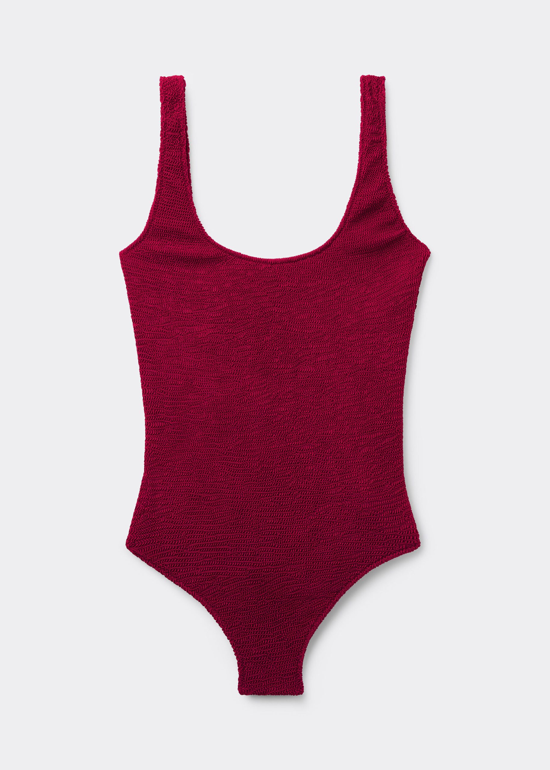 Round neck one piece swimsuit, wireless and unpadded for a natural effect. The style features a crinkle fabric with a three-dimensional effect. Brazilian style coverage in back and ‘80s style high cut legs. Fully lined.