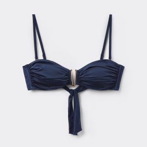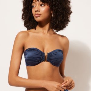 Bandeau bikini top with lightly padded cups. The side boning guarantees good support. The style features shiny fabric with a golden accessory at the center of the bust. Adjustable and removable straps. Back tie closure.