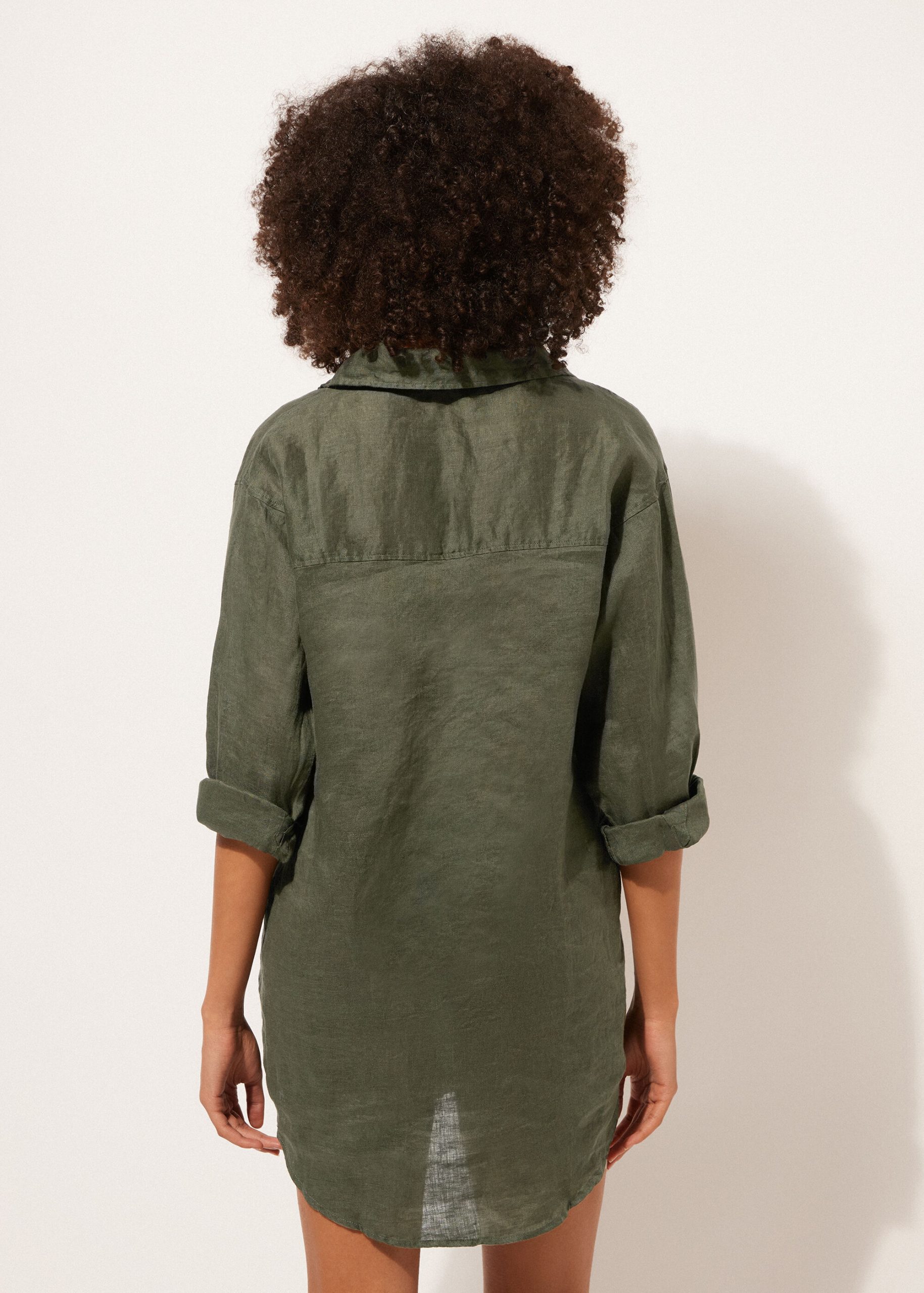 Button up shirtdress in linen for those who love natural fibers, with lapel collar and long sleeves. Above-the-knee length.