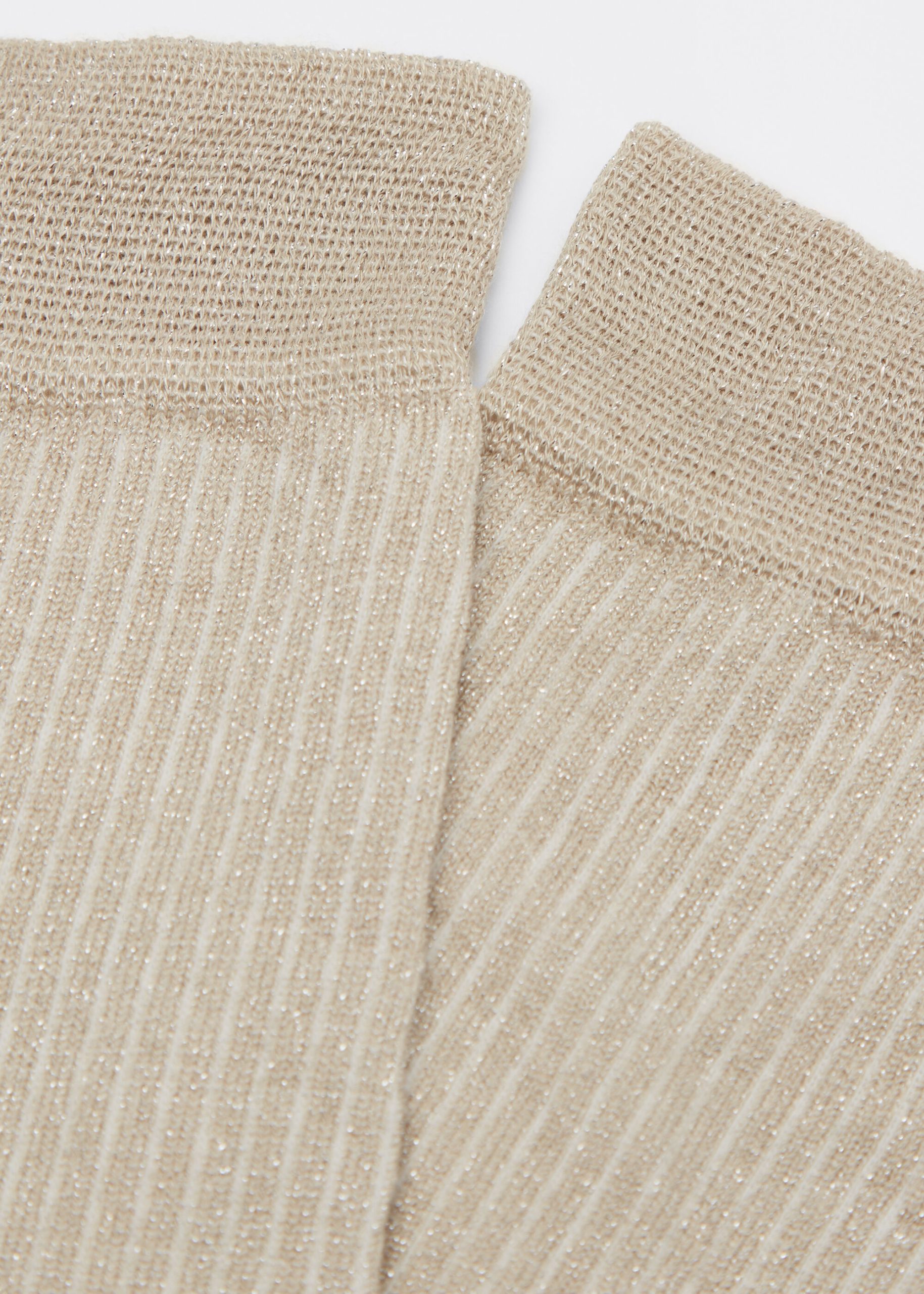 Women’s long ribbed socks with glitter thread. This design adds a touch of shine and style to your outfit, guaranteeing optimal comfort and fit to wear on different occasions.