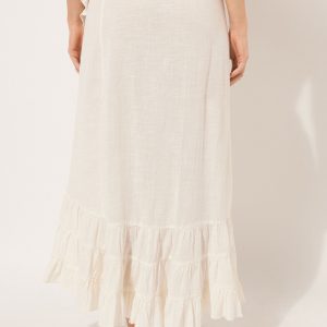 Long cotton skirt with ruffle, perfect as a cover-up or for a summer outfit. Its length and lightweight fabric guarantee comfort and freshness, while the ruffle adds a feminine touch. Suitable for the beach, going for a stroll or a casual summer look.