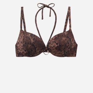 Push-up underwire bikini top with especially soft, graduated padded cups. The style features a sophisticated dark brown animal pattern embellished with removable ties that attach at the center of the bust, providing a touch of modernity and fashion. Adjustable shoulder straps and back hook closure with two adjusters.