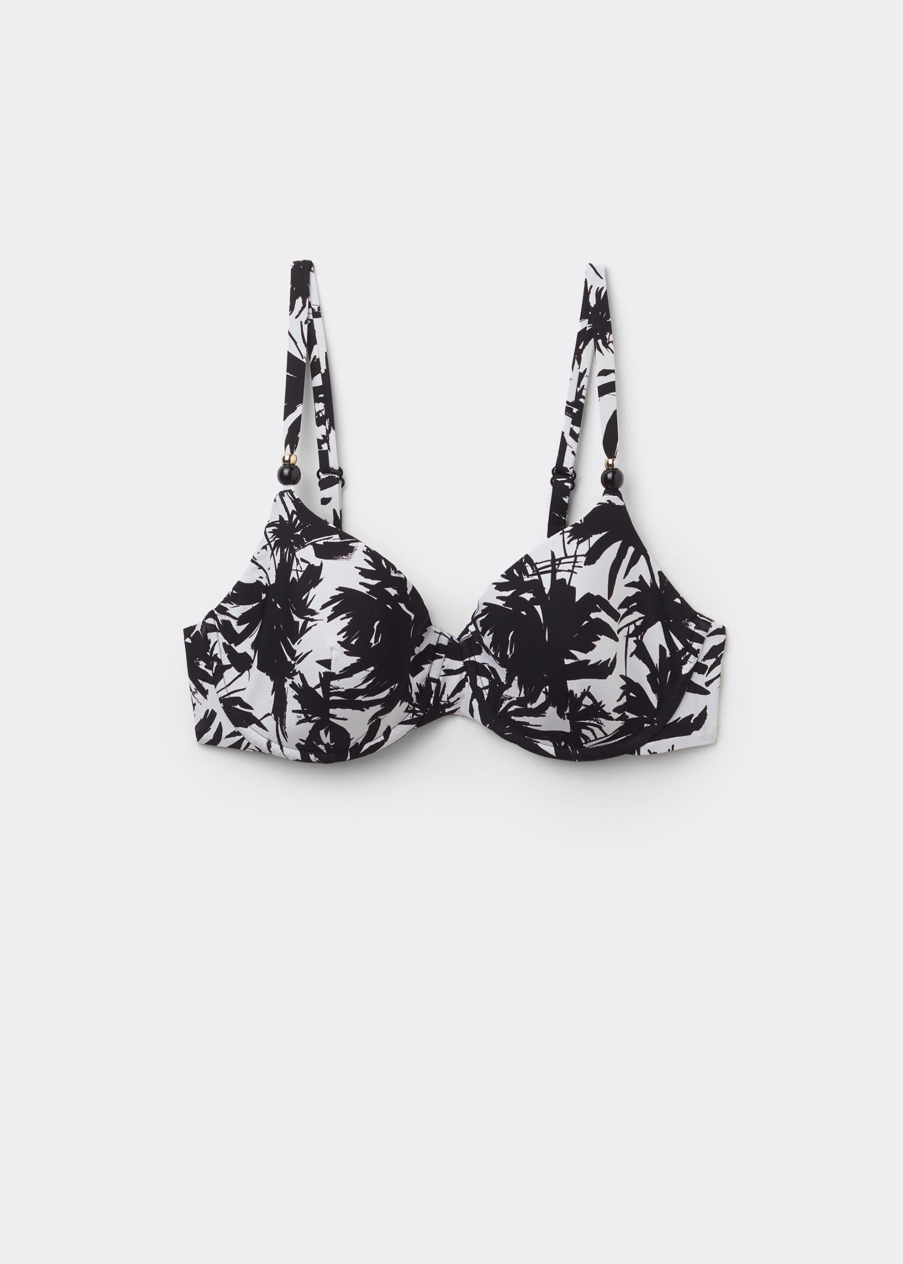 Push-up bikini top with light padding and underwire, suitable for fuller busts. The style features a black and white palm tree patterned fabric with small two-tone pearl embellishments. Adjustable, non-removable shoulder straps. Back hook closure with two adjusters.
