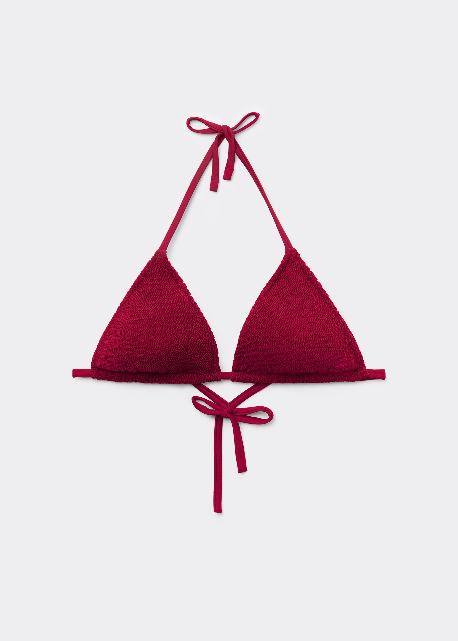 Slide triangle bikini top with removable cups and no underwire for a natural effect. The style features a crinkle fabric with a three-dimensional effect. The shoulder straps have eyelets on the ends so they can be hooked onto the back band or tied behind the neck. Back string tie closure.