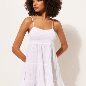Short cotton dress with thin adjustable shoulder straps and smocked bodice that creates a gathered and stretch effect, providing a comfortable and snug fit. Full above-the-knee length ruffle skirt.
