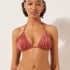 Wireless triangle bikini top with light internal padding. The shoulder straps with buttonholes can be inserted into the band or fastened behind the neck. Fastens with a string tie in back. Shine in style in this exclusive top, embellished with gemstone threads. The perfect top to pair with your glamorous evening outfits. PLEASE NOTE: this garment has been hand embellished. Each garment is unique. Due to the delicate nature of this garment, please take care when washing.