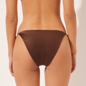 Brazilian bikini bottom with soft sides, featuring a bright fabric with a silky effect with ruffles. Fully lined with invisible seams.