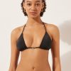 Thong bikini bottoms with side string ties to adjust the fit. It features a minimal fit that exalts the silhouette with a touch of sensuality and refinement. The slightly rounded waist at the front allows for both a regular and more high-cut fit, depending on one’s physique. The bright silk-effect fabric embellished by elegant golden details radiates a sophisticated sensation of discrete luxury. Fully lined with invisible seams.