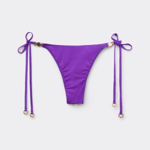 Thong bikini bottoms with side string ties to adjust the fit. It features a minimal fit that exalts the silhouette with a touch of sensuality and refinement. The slightly rounded waist at the front allows for both a regular and more high-cut fit, depending on one’s physique. The bright silk-effect fabric embellished by elegant golden details radiates a sophisticated sensation of discrete luxury. Fully lined with invisible seams.