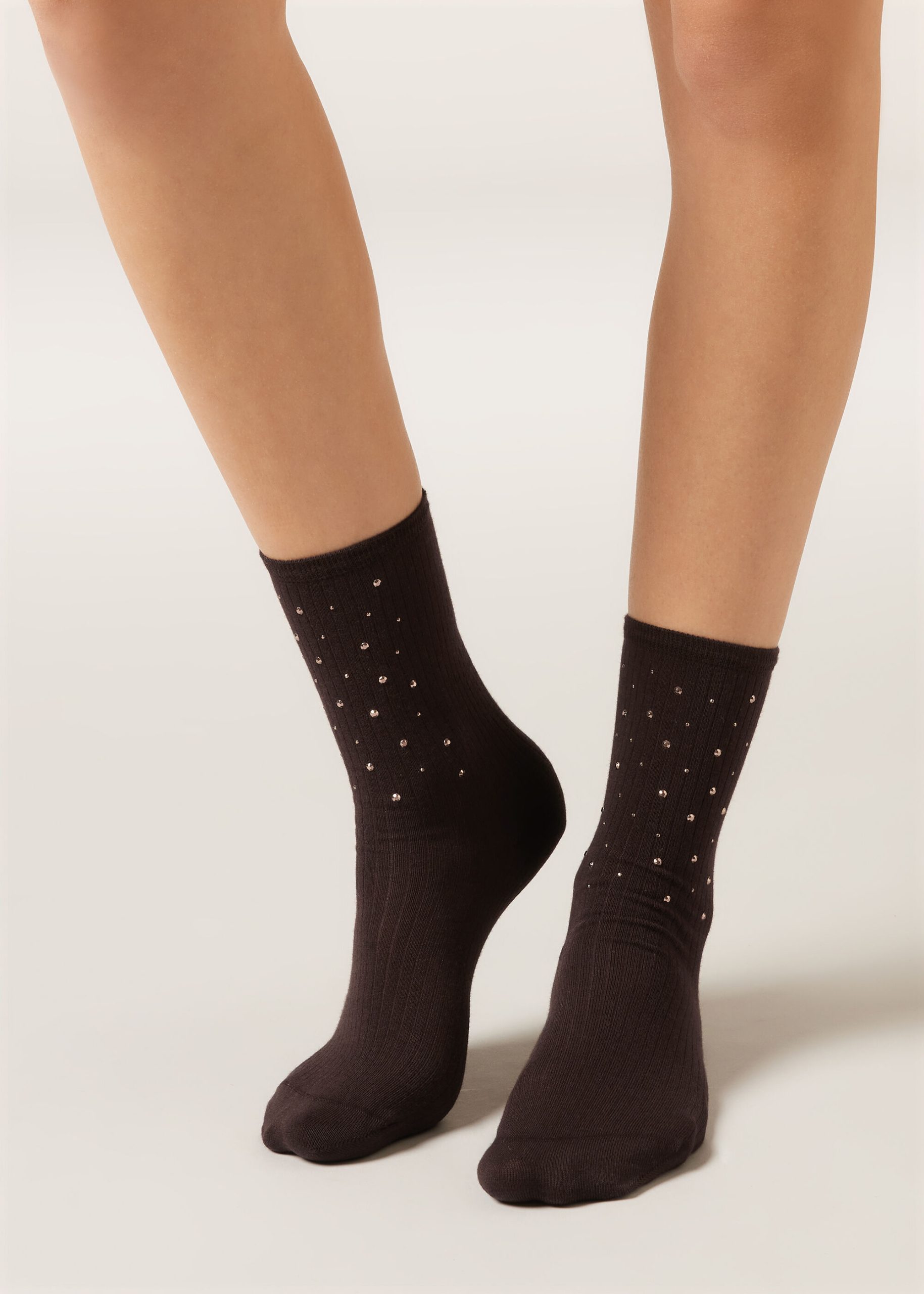 Women’s short socks in soft ribbed cotton combine comfort and a luminous style. The front stud appliqués make them unique, perfect for adding a rock-chic touch to your look.