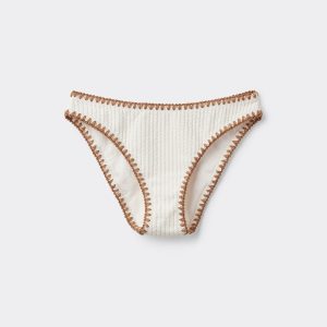 Fully lined bikini bottom with invisible seams in crinkle fabric embellished with contrast color embroidery. The slightly rounded waist at the front allows for both a classic or more high-cut fit, depending on one’s physique.