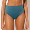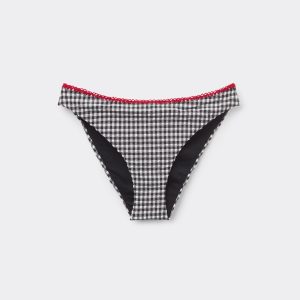 Fully lined bikini bottoms with invisible seams made from a vichy pattern fabric, enriched by a refined red trim. The slightly rounded waist at the front allows for both a classic or more high-cut fit, depending on one’s physique.