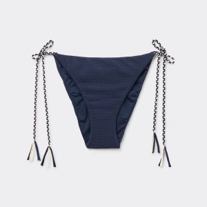 Bikini bottoms with side ties featuring a two-toned braid to adjust the fit. The slightly rounded waist at the front allows for both a classic or more high-cut fit, depending on one’s physique. The style is defined by a three-dimensional monochrome fabric with a slightly crinkled texture that adds depth and sophistication. Fully lined with invisible seams.