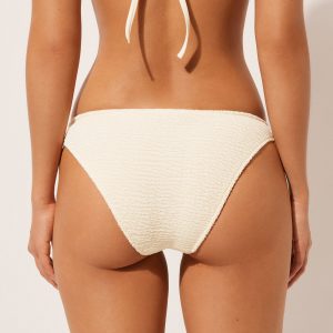 Fully lined bikini bottoms with invisible seams in a crinkle fabric with a three-dimensional effect. The slightly rounded waist allows it to be worn either as normal or with the legs higher to show off the physique.