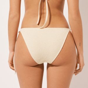 Fully lined bikini bottoms with invisible seams in a crinkle fabric with a three-dimensional effect. The slightly rounded waist allows it to be worn either as normal or with the legs higher to show off the physique.