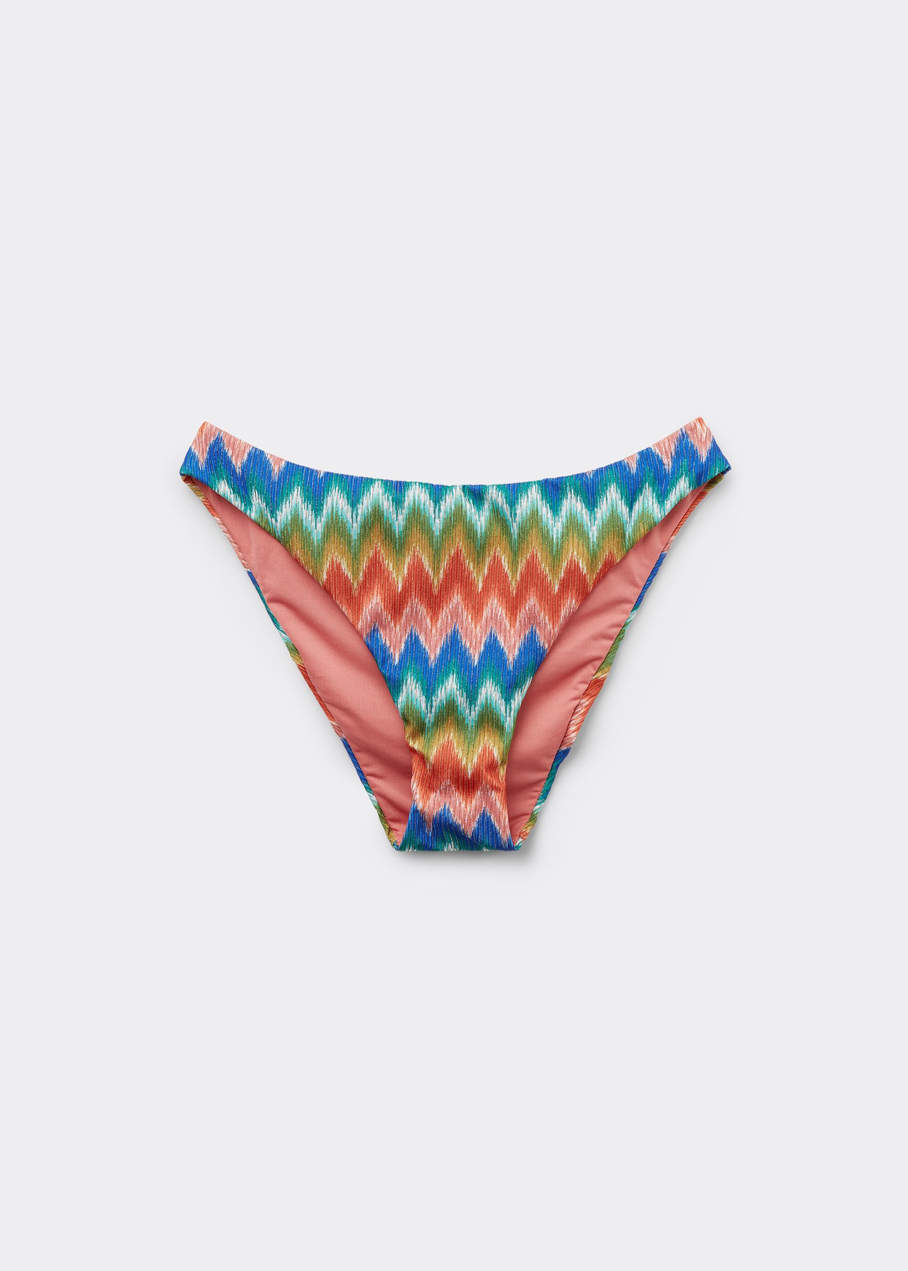 Fully lined bikini bottoms with invisible seams in order to not leave marks. The rounded waist at the front allows for both a classic or more high-cut fit, depending on one’s physique. A dynamic and sophisticated chevron motif, in bright colors on slightly ruched fabric, perfect for a modern and refined look.