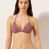 Lightly padded tank-style bikini top, wireless for a natural effect. The side boning helps support the bust. The style features a sophisticated dark brown animal pattern embellished with a cut out at the center of the bust and with small nickel-free rings, providing a touch of modernity and fashion. Back string tie closure.