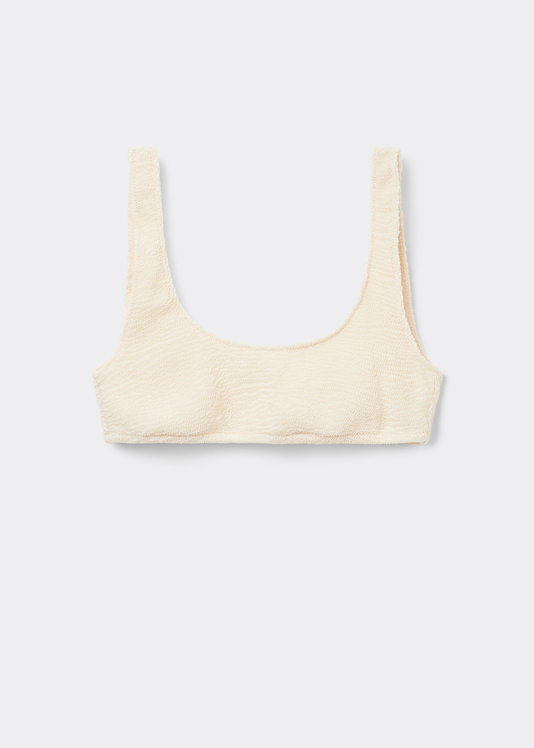 Sporty tank-style bikini top with no padding or underwire for a natural effect. The style features a crinkle fabric with a three-dimensional effect. Fixed straps and closed back.