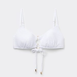 Wireless tank-style bikini top with lightly padded cups. The side boning helps support the bust. The style features an opening at the center of the bust embellished with two small nickel free rings. Three-dimensional especially soft fabric with diagonal motif. Adjustable shoulder straps and thin tie closure on the back embellished with golden tips.